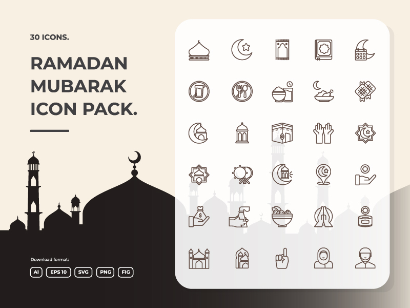 30 Muslim and Ramadan Mubarak theme concept illustrations line icon set
